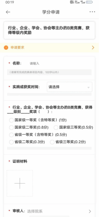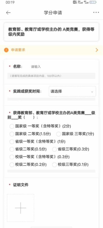4. 根据自己的获奖情况选择自己申请的学分名称填写自己的竞赛名称
