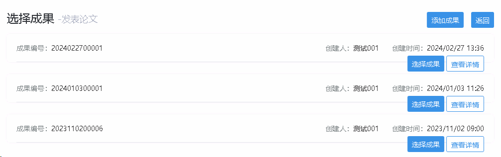 在后台选择成果数据,需注意:只能选择成果库里审核通过的成果。(如果成果未审核通过,需要等待审核等过后再进行选择)