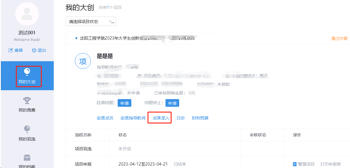 点击“创新创业”进入系统后台。在结题阶段录入需填报内容。