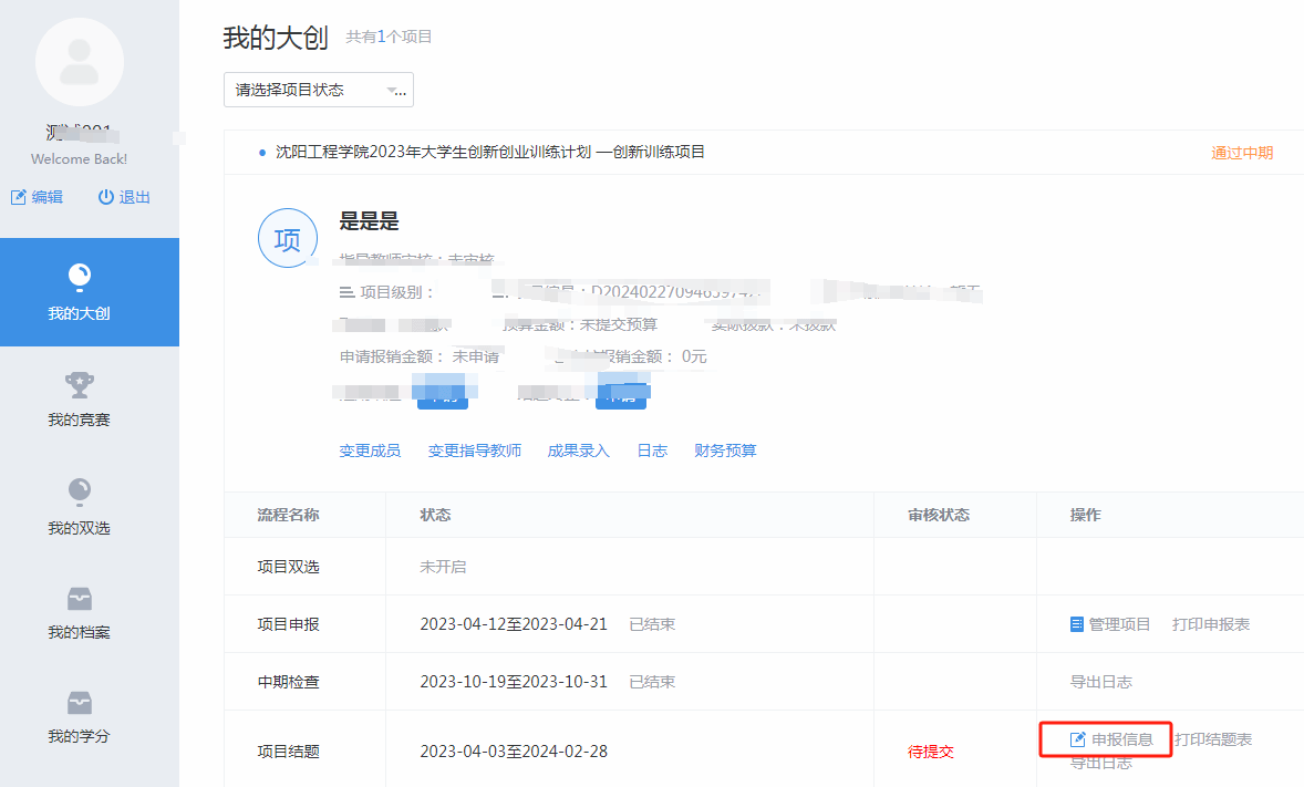 点击“申报信息”录入结题成果。