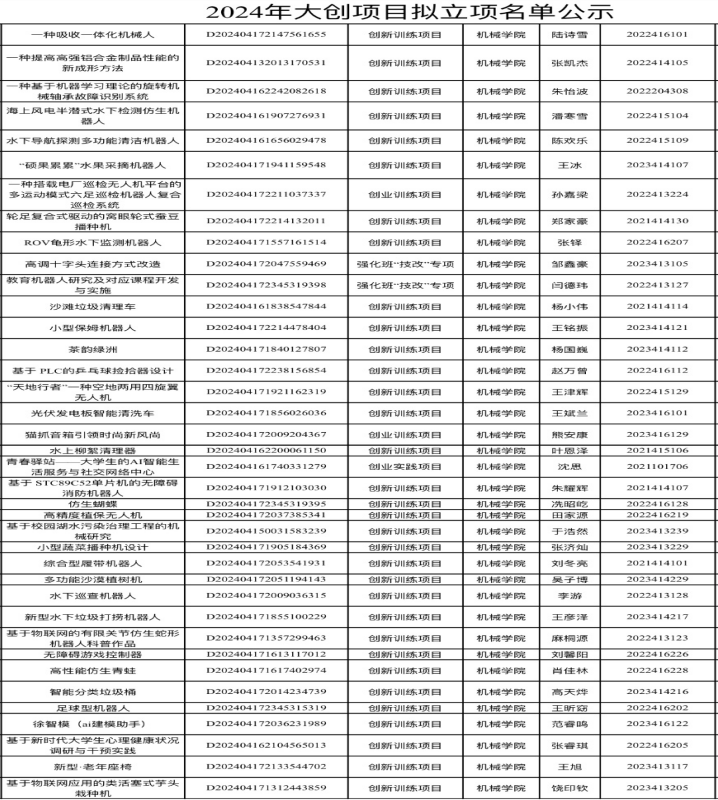 年机械学院大学生创新创业训练项目拟立项名单如下: