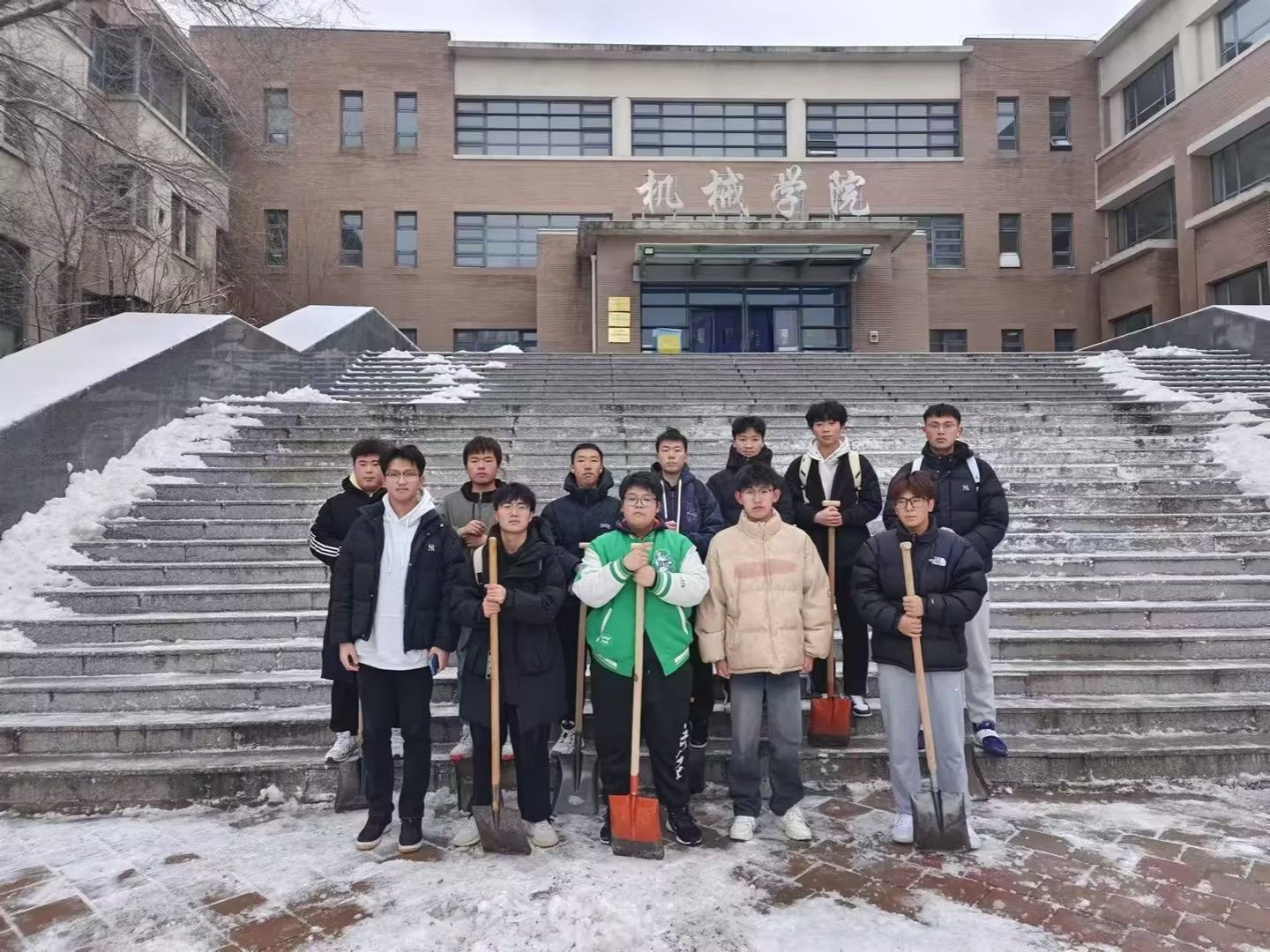 在学生宿舍区域和学院教学楼区域,志愿服务学生干部不畏严寒,手持铁锹工具,有序清理台阶冰雪,校园里的各个角落都留下了学生干部们讲奉献、勇担当的身影。