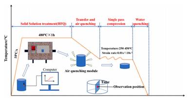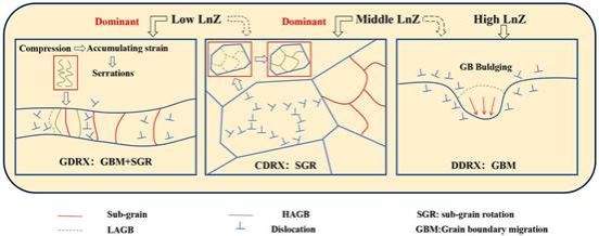 摘要:通过固溶处理(480 ℃/1 h)和等温淬火(HFQ)工艺相结合的等温压缩实验研究了AA7050合金的热变形行为。在这项研究中建立了固溶合金的Arrhenius本构模型和热加工图。此外,通过TEM和EBSD观察还确定了微观结构演变和动态再结晶机制。结果表明,最佳工艺参数处在390-450 ℃和0.01-0.1 s-1,在高应变率下很容易发现裂纹,原因是绝热剪切带的产生。热变形过程中在Al基体可观察到η'和η的沉淀,η'和η的尺寸随着应变率的降低而变大。由于高扩散速度和充足的时间,温度升高。η相的形状逐渐在450℃/0.1s-1条件下由球形变为板条状。在低lnZ(25.96–30.87)条件下,DRX机制以GDRX为主,具有砖状晶粒的特征,依赖于晶界迁移和亚晶粒旋转。在中等lnZ(32.84-37.77)值,观察到晶粒内部存在大量亚结构,CDRX在再结晶过程中起着重要作用,依赖于亚晶粒旋转。在高lnZ值时,晶粒特征是晶界凸起。(图1和图2分别为试验方法图和再结晶机制演变图)